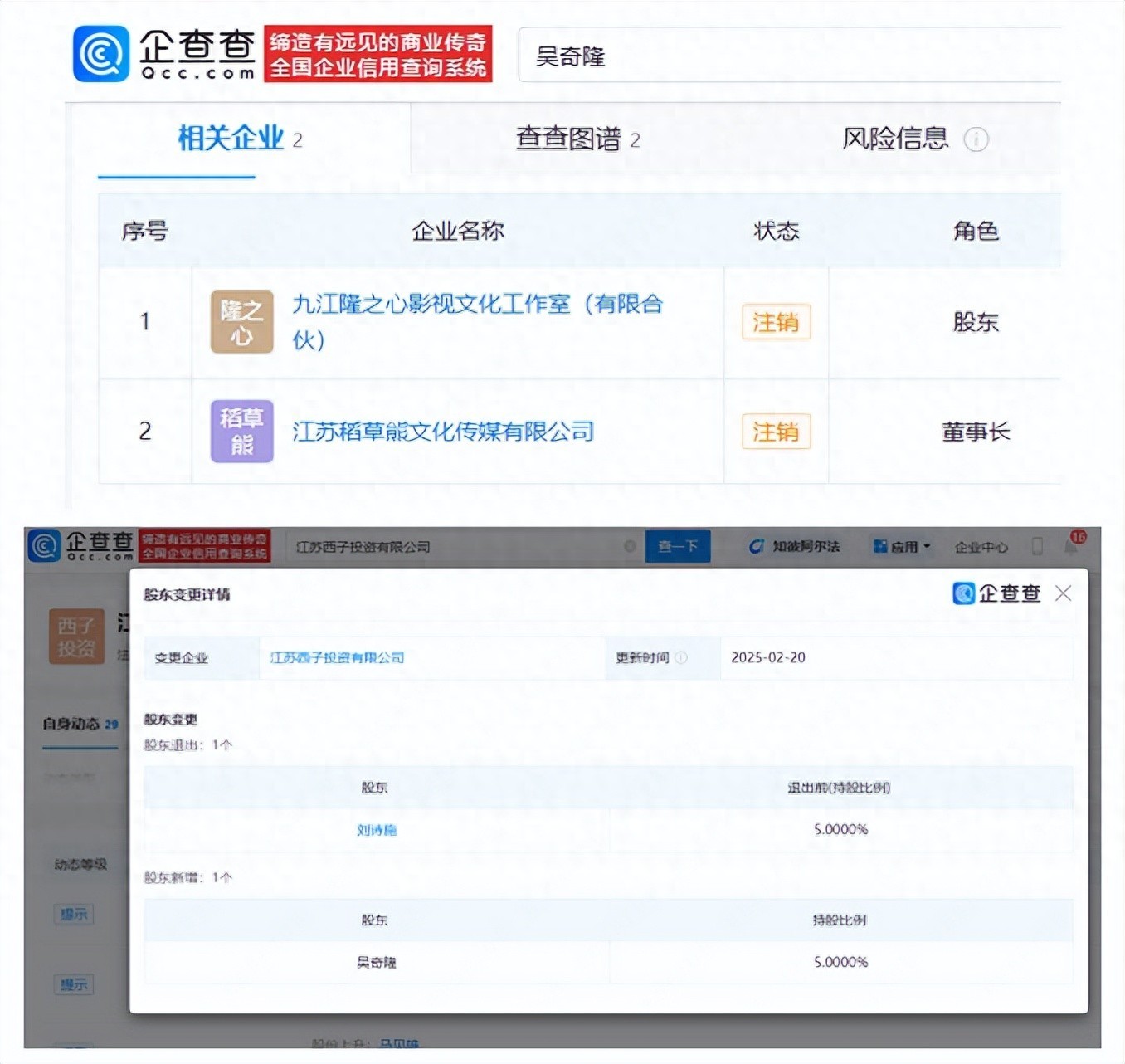 2月20日,据红星新文娱报道,近日,江苏西子投资有限公司发生工商变更,原股东刘诗诗(本名 刘诗施)将所持5%股权转让给吴奇隆。